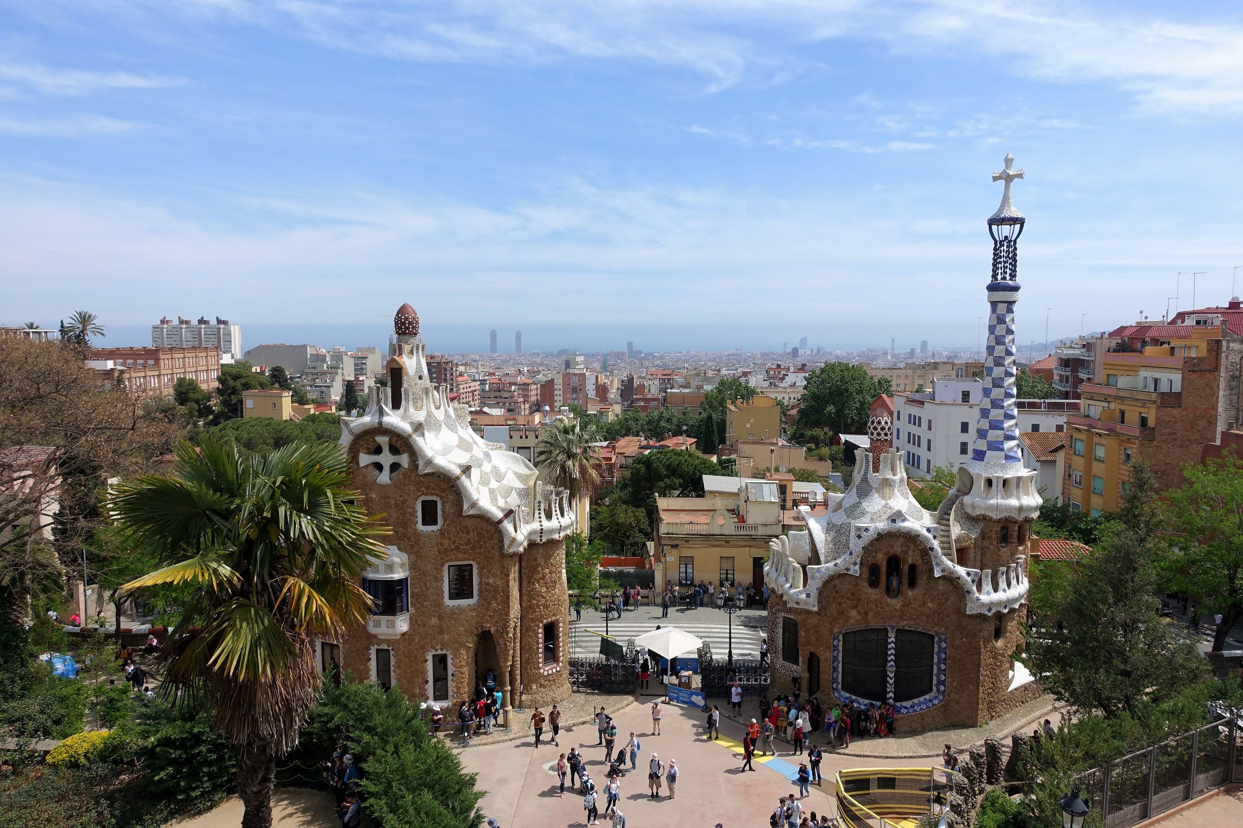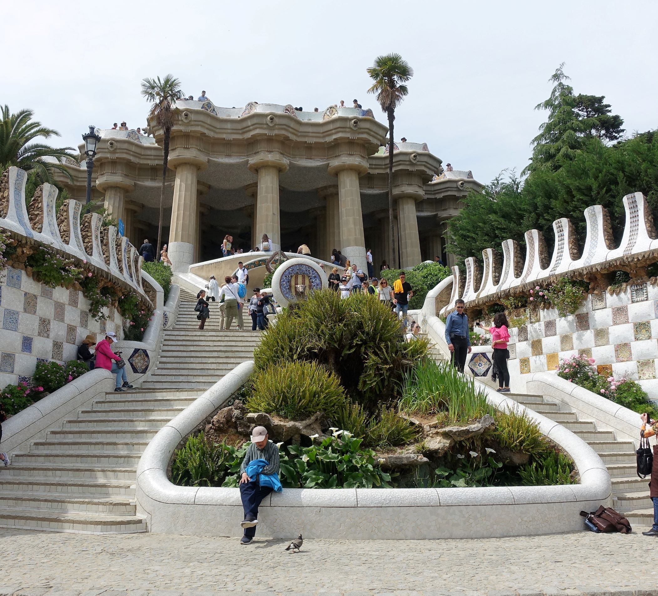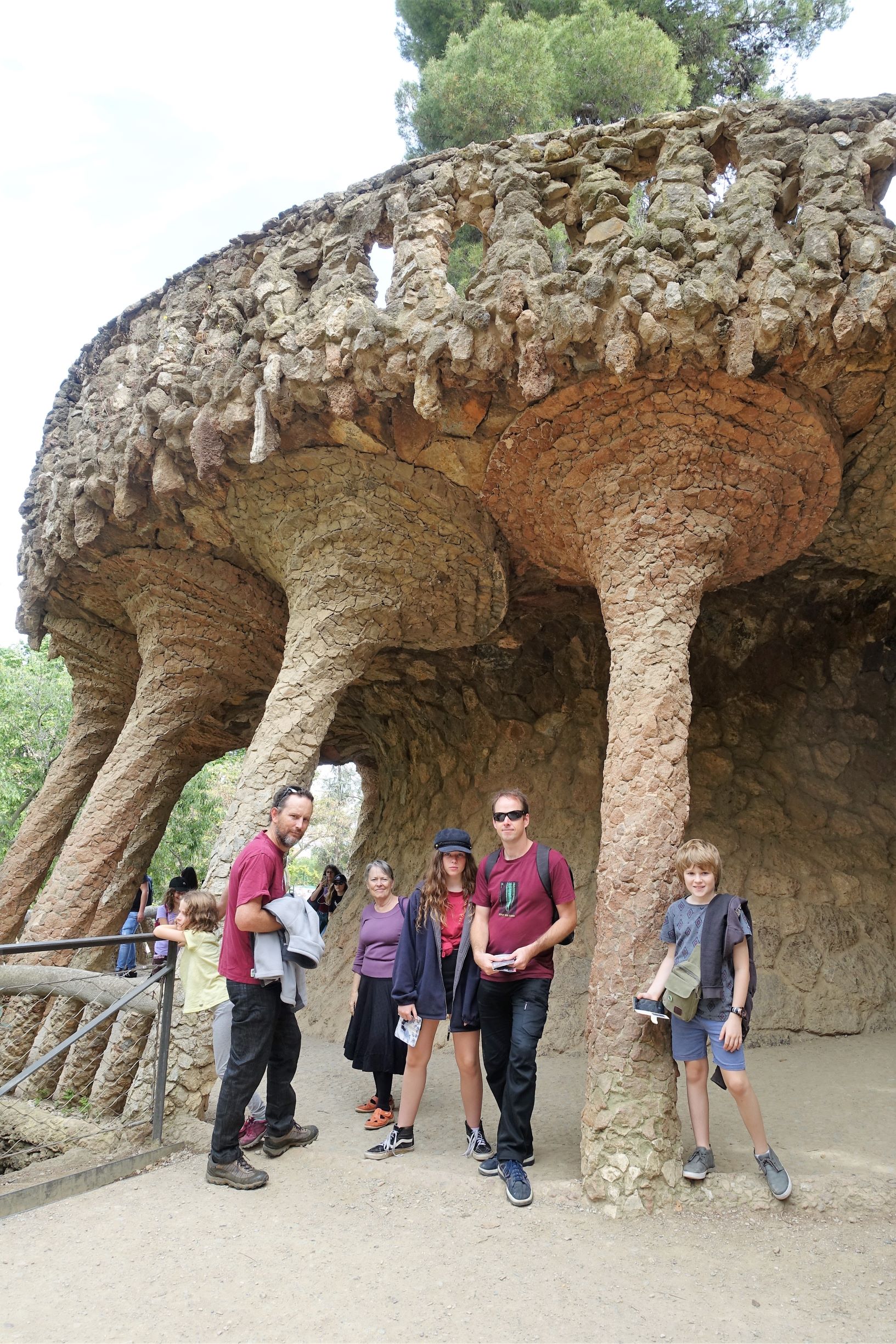 Parc Guell was up on a hill. There were columns where we walked and one of the columns looked like a woman. I also remember a colourful lizard statue on a set of stairs with beautiful mosaics. Gaudi’s house was there but we did not see it. There were two other houses that looked like ginger bread houses.