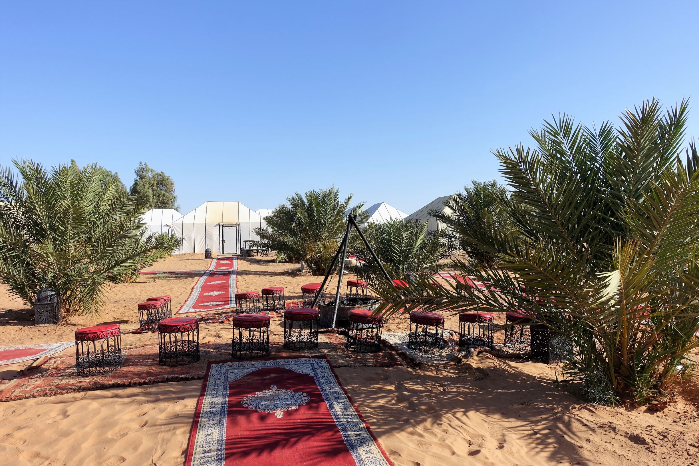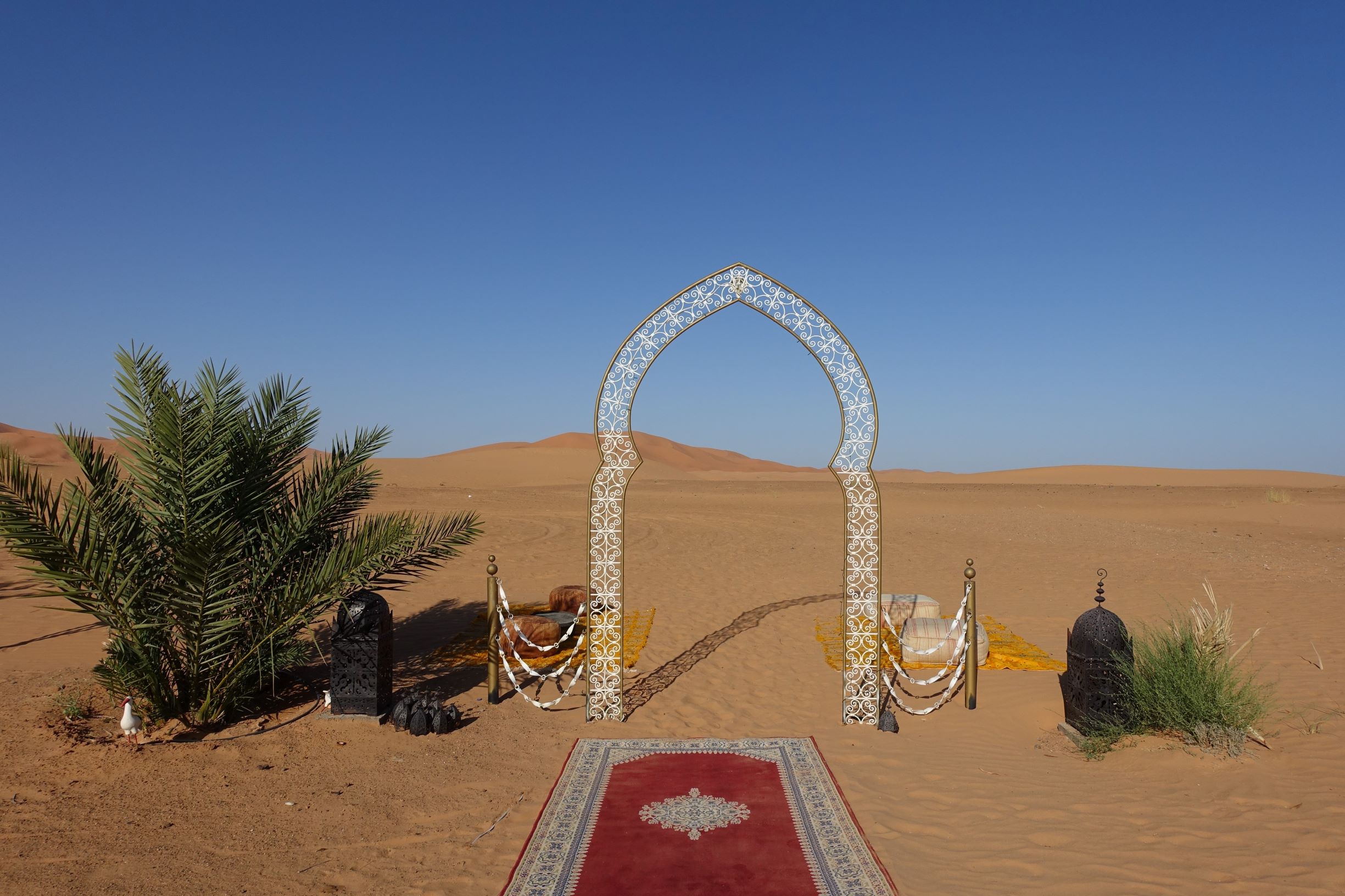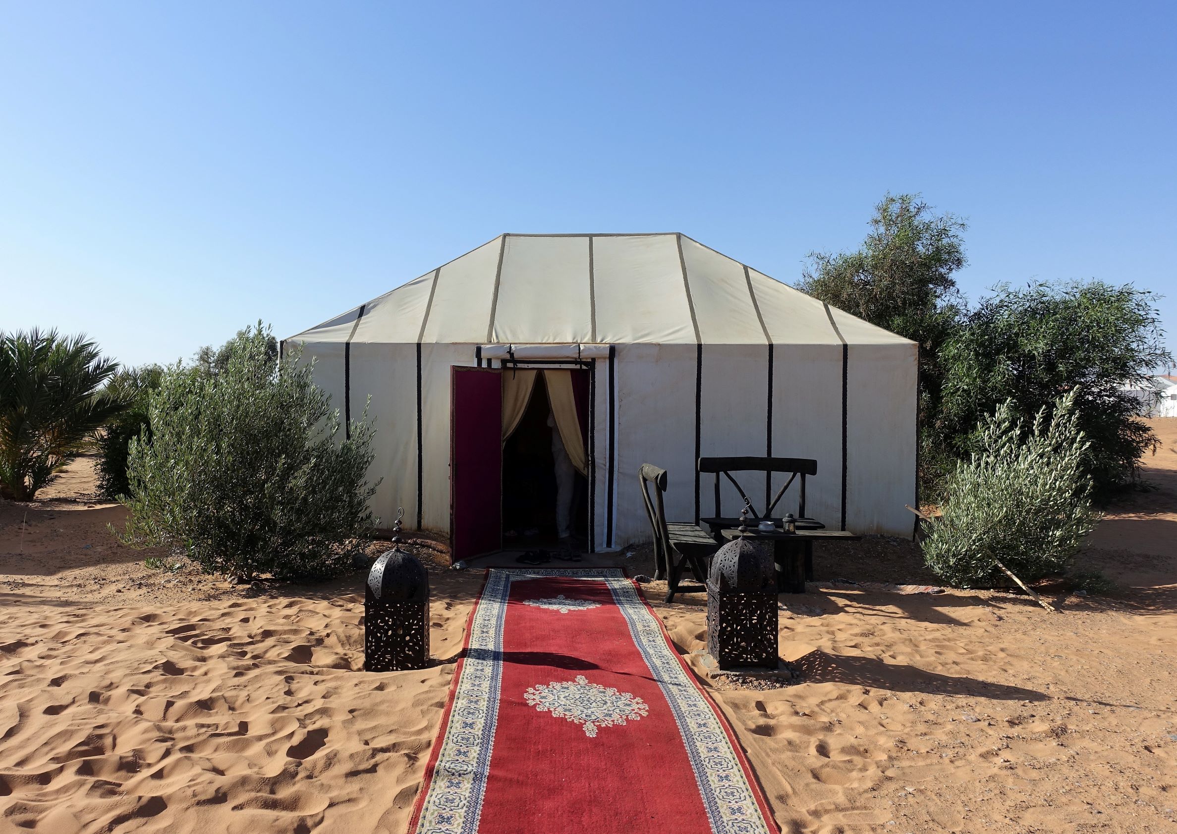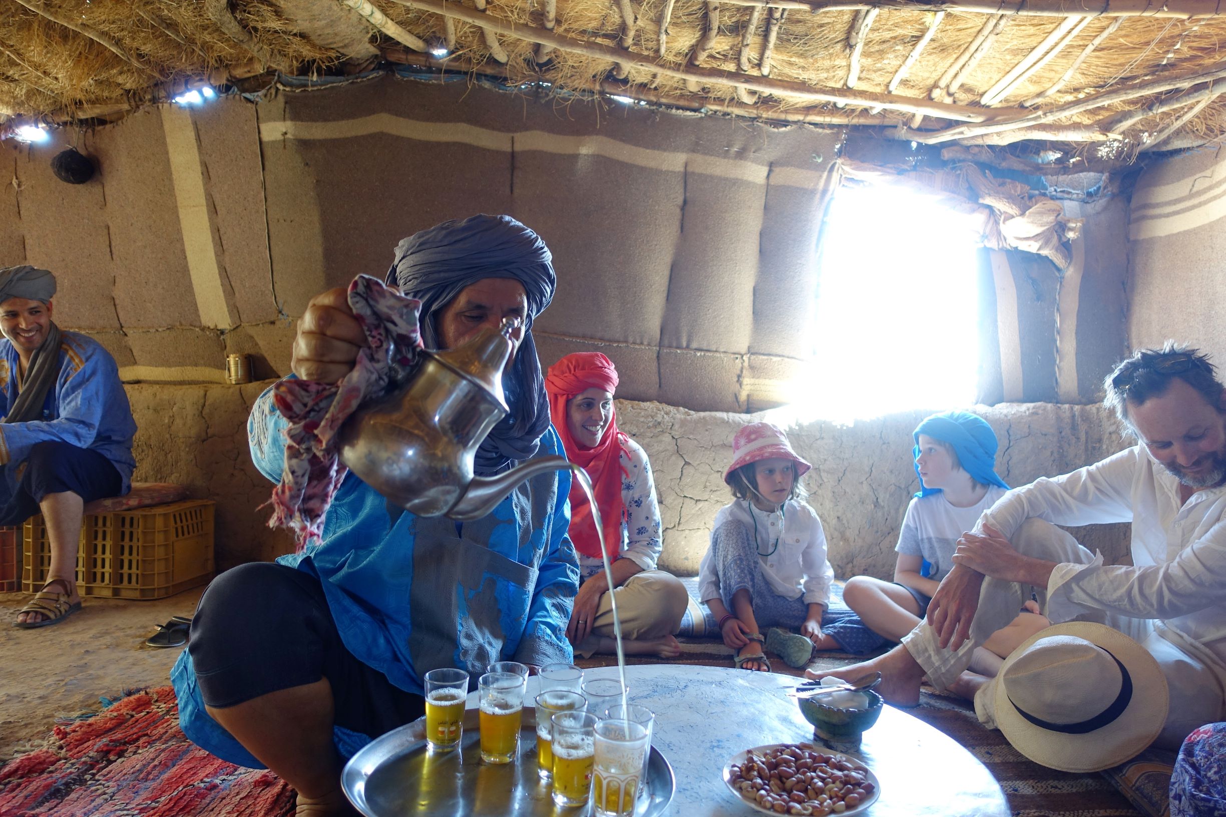 Our hosts at the desert camp greeted us Moroccan style by laying down carpets on the warm sand and providing a silver platter with sweets, nuts, dried fruit and mint tea, complete with teapot and cups.