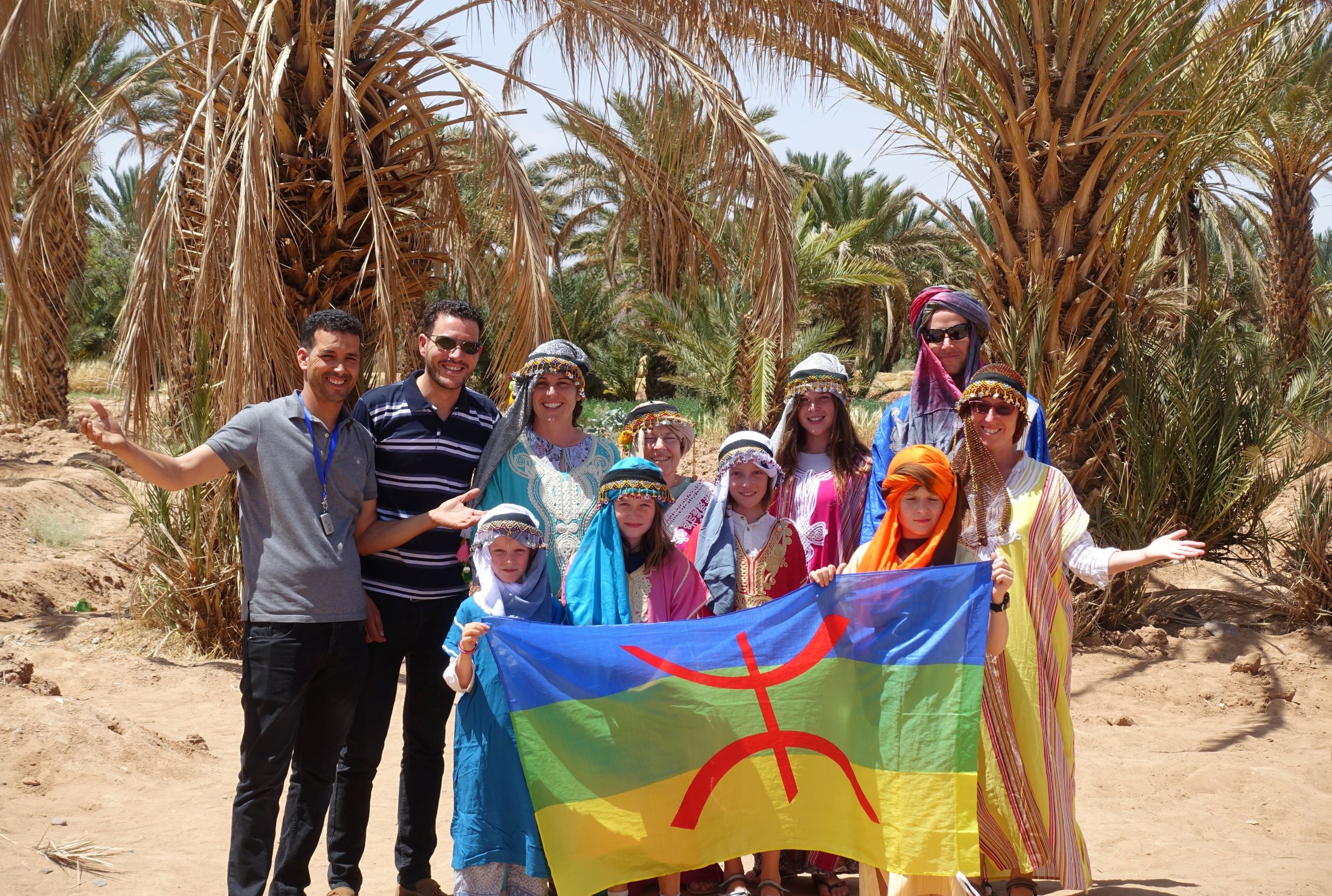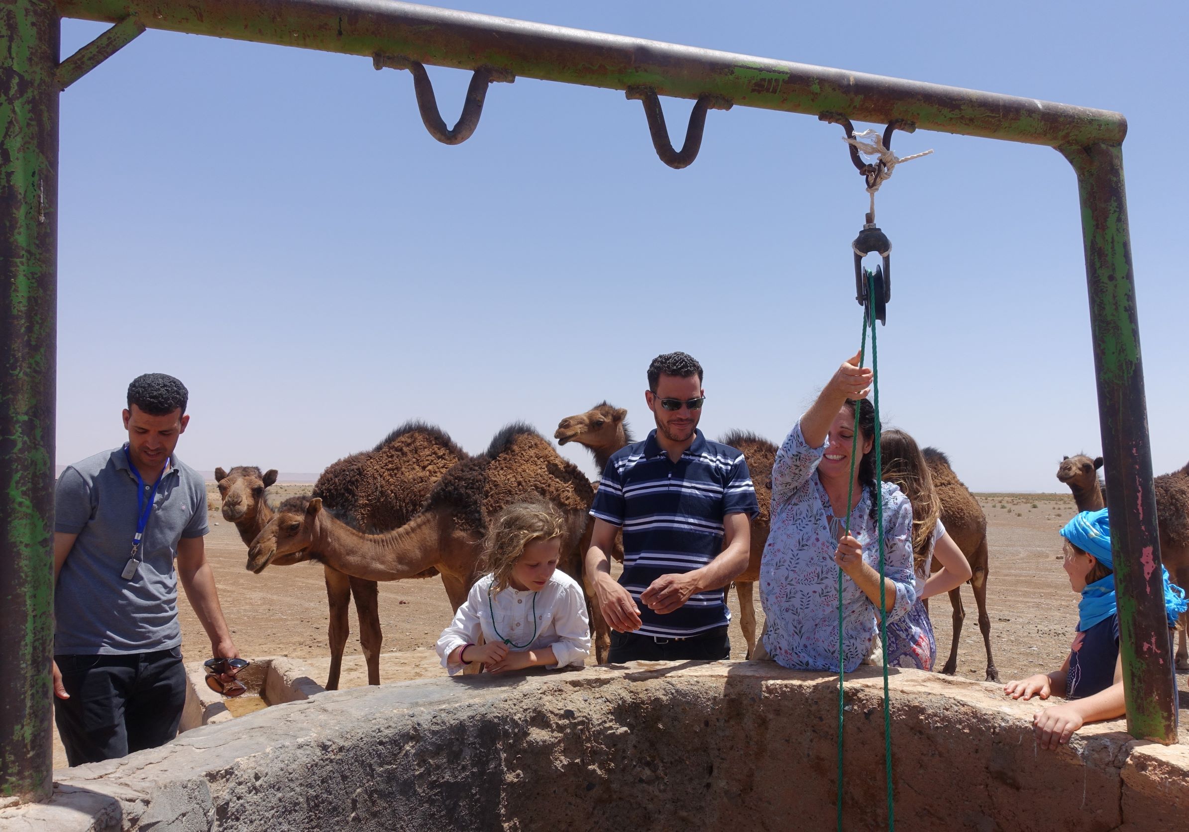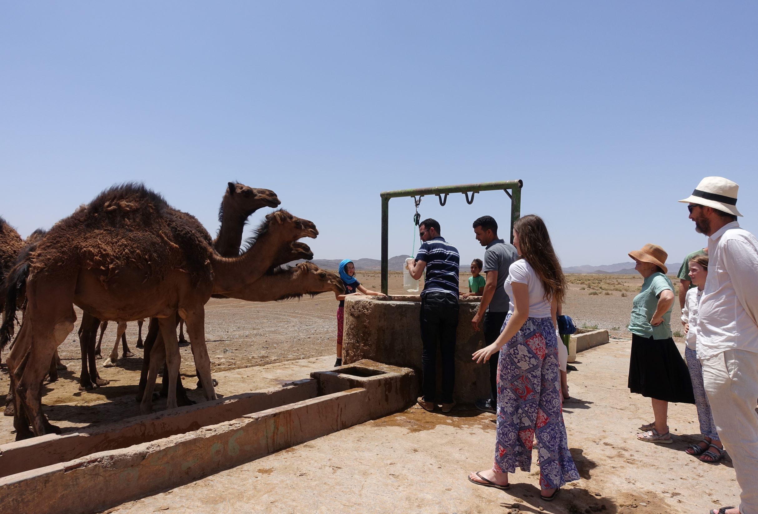 A traditional kasbah.Trying out traditional dress.With our Berber guides, Mohammed and Said, in front of the Berber flag.Drawing well water for some thirsty camels.VERY thirsty camels!