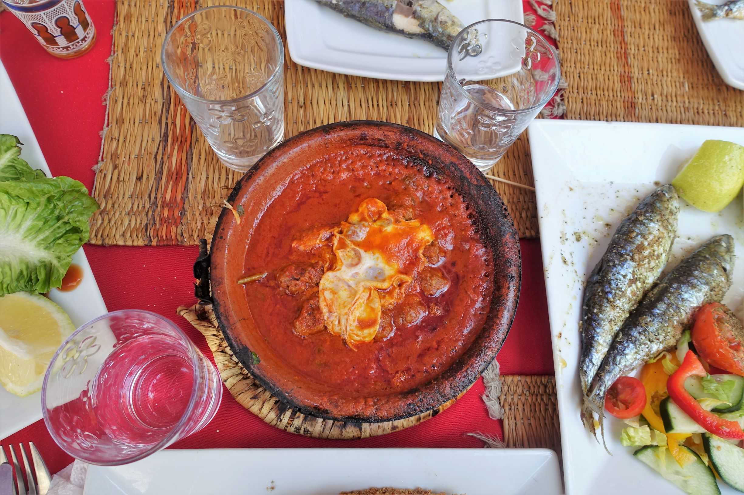 Enjoying a home cooked dinner in our first riad.Tagines and sardines in Essaouira.