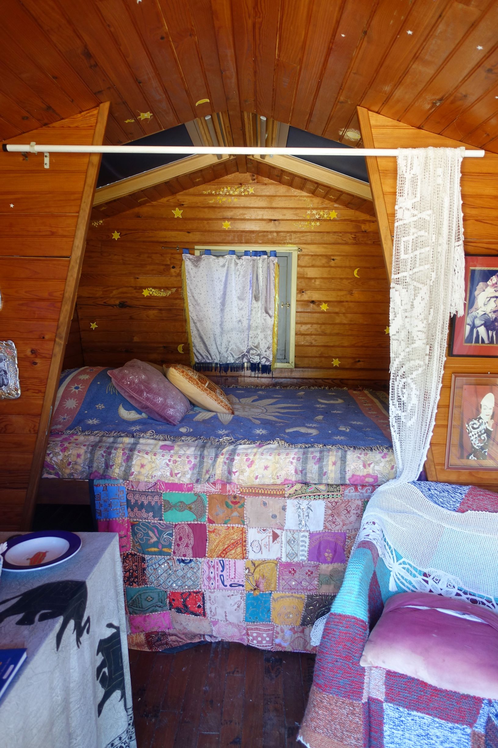 Inside a Gypsy fortune-teller’s caravan. Just room for her table and a small bed.