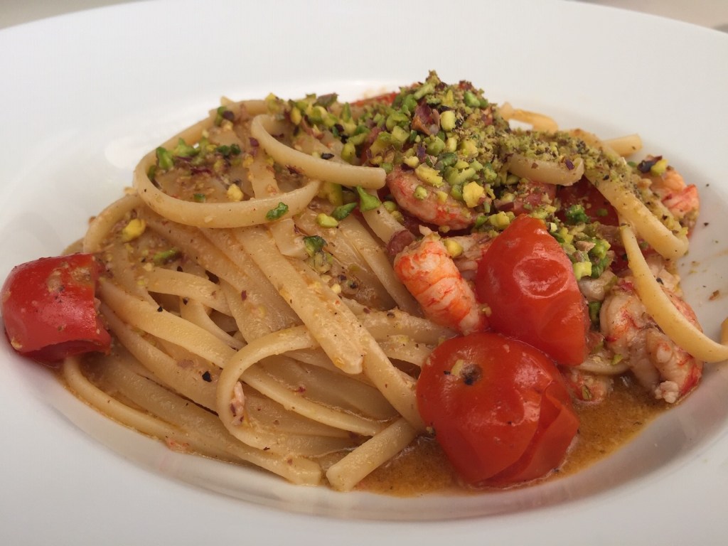 The sweetest shrimp pasta with pistachios and a perfectly scrumptious almond pastry.