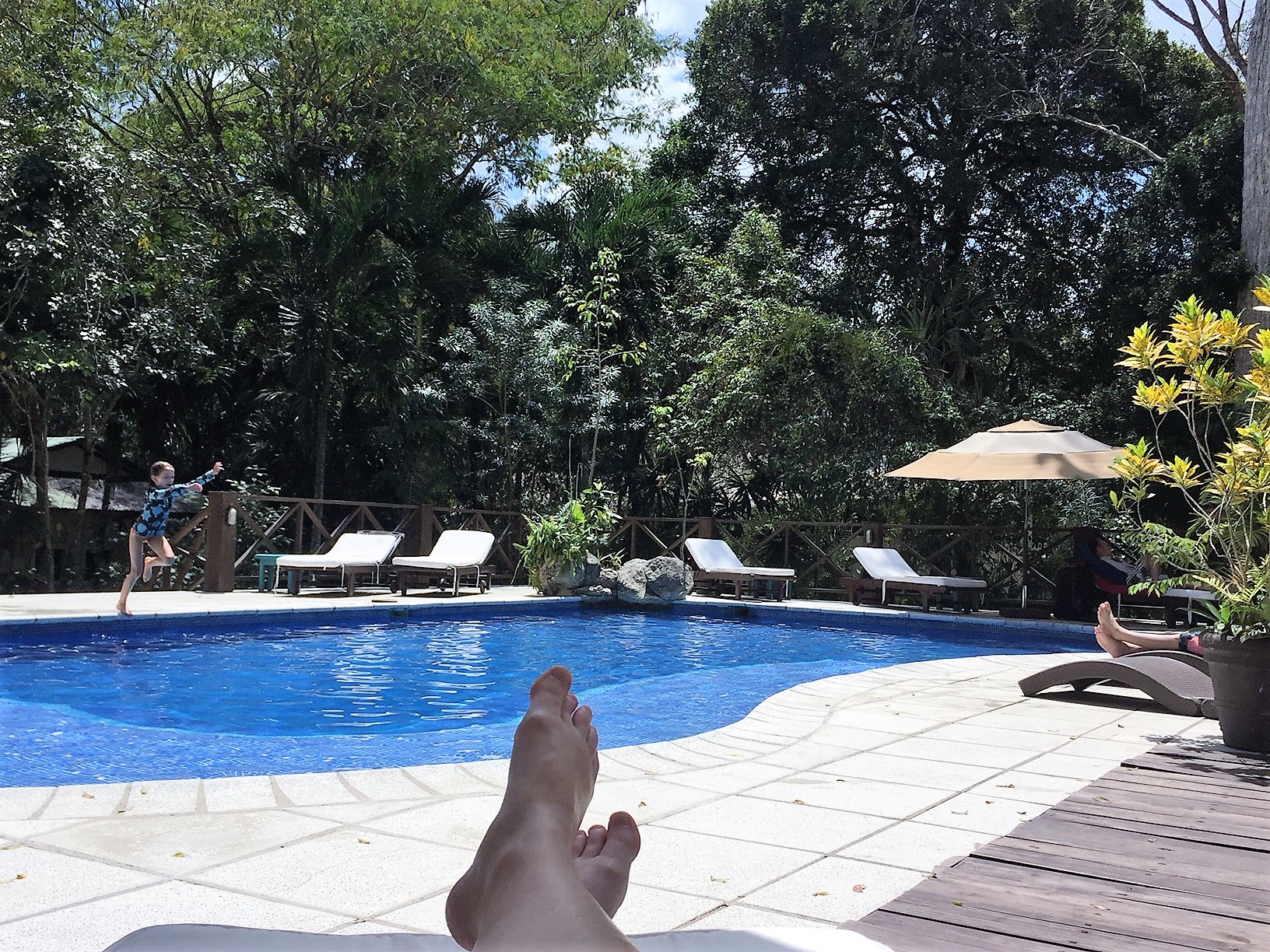We did one important thing right though – we splashed out on two nights’ accommodation at Jungle Lodge Hostel, literally right next door to the entrance to Tikal. When we arrived exhausted and hungry, we ate a huge brunch on the hotel veranda and literally fell into the swimming pool.