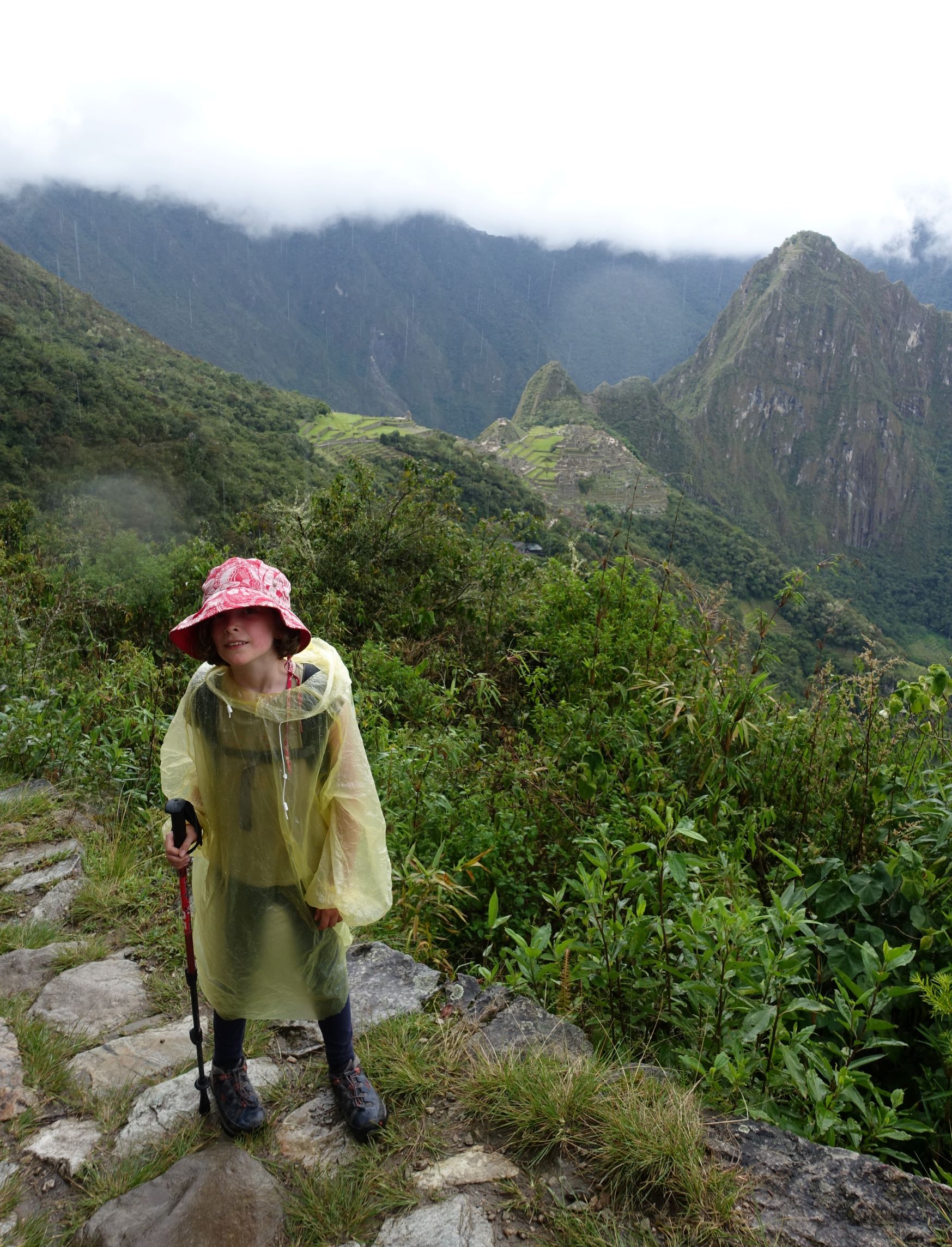 The 2-day Inca trail trek is a bit of a misnomer. It actually involves one long day of trekking – either 10km to Machu Picchu, from where you can take a bus the rest of the way – or 16km all the way to Machu Picchu Pueblo. The last 6km includes almost 5kms of steps – all going down. This trek was a new challenge for Eliane and Maille: the longest trek they have done in one day. 10kms was quite enough for Maille, on arrival at Machu Picchu she was keen to take the bus. But Eliane was equally keen to continue for the full 16kms. She achieved this with no problems whatsoever – even giving up her hiking pole on the way down to a fellow trekker whose legs were giving way beneath him.