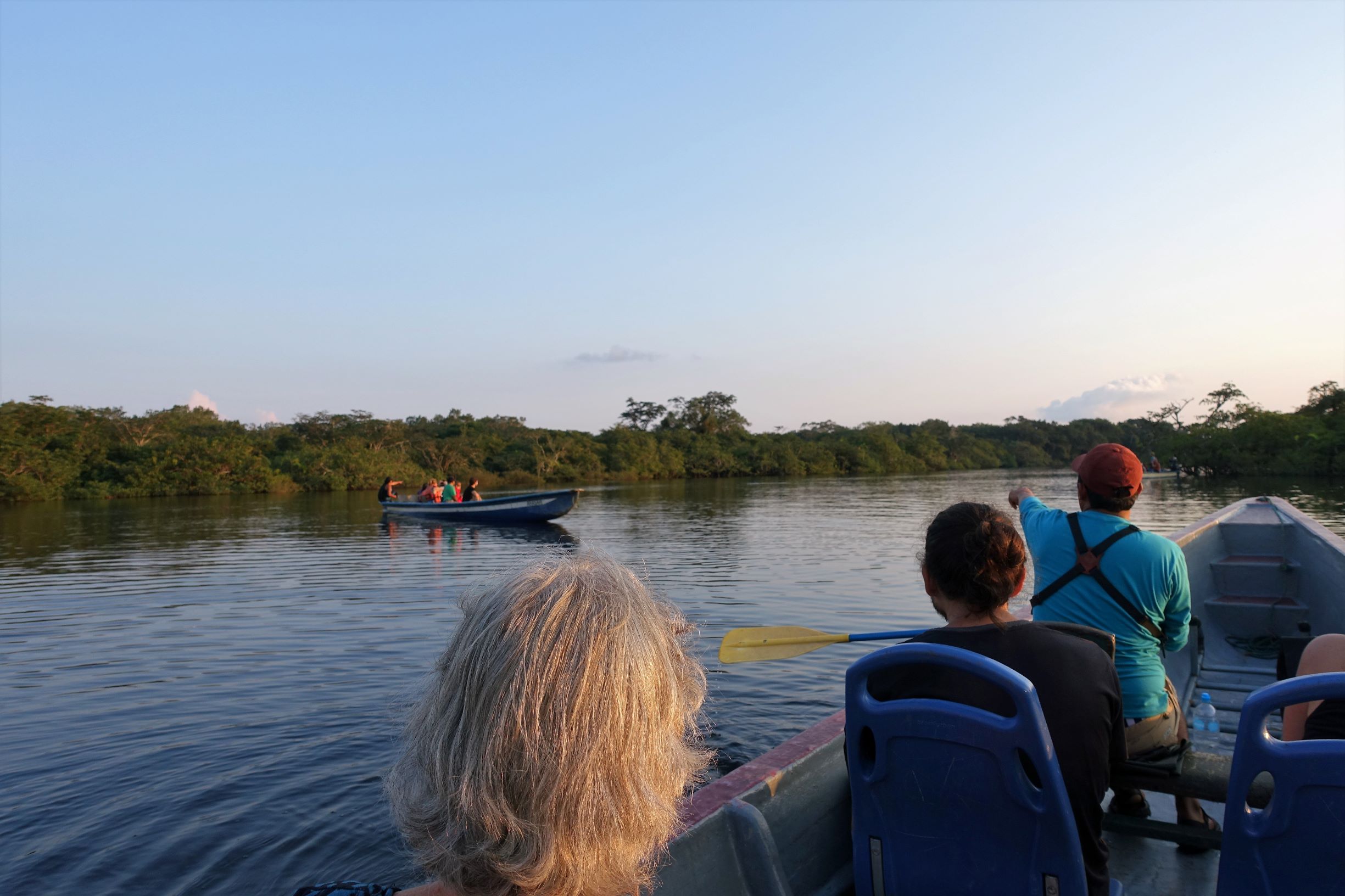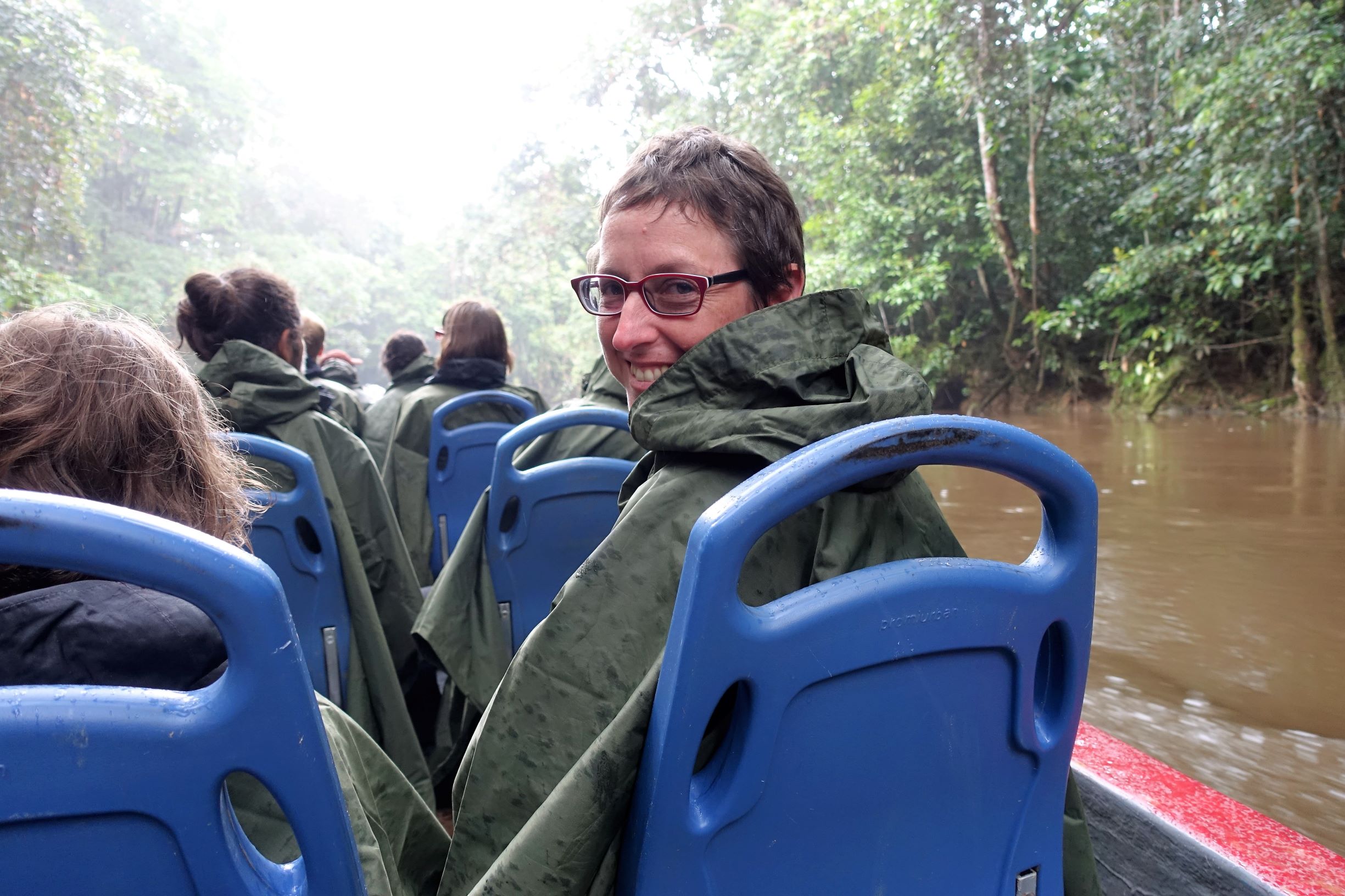 Heading off to Cuyabeno Lodge in our motorized canoe, wearing our rain ponchos, and wondering what we were getting into…